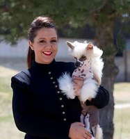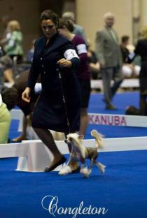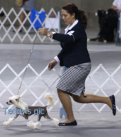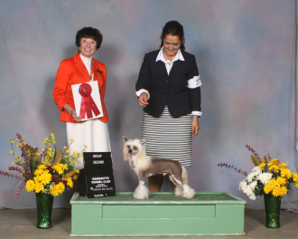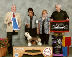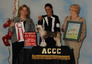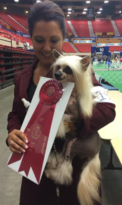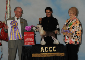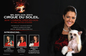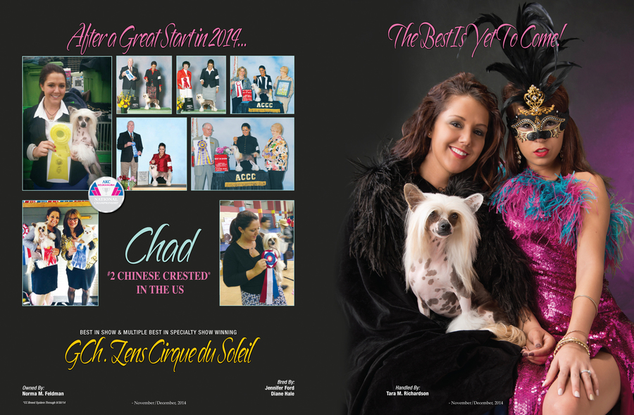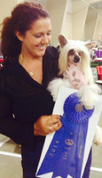 Born in November, 2011, GCH Zen's Cirque du Soleil (Chad) has proven himself over and over as a superstar in the AKC Conformation show ring. Bred by Jennifer Ford and Diane Hale, Owned by Norma M. Feldman and handled by Tara M. Richardson, Chad has won a Best in Show, multiple Best in Specialty Show awards, was awarded BIS in the 2014 American Chinese Crested Club Regional Championships, an Award of Merit in the 2015 Westminster Kennel Club dog show, and numerous Group 1 placements in multiple shows. In addition to being a superstar in the show ring, Chad has also produced several beautiful puppies who are currently doing awesome in the show ring themselves. Chad is PRCD/PRLL clear by testing and parentage. He is a beautiful example of the breed and a true treasure to own with a lively and fun personality that he has been consistently passing on to his offspring. Chad has his own facebook page - friend request him at Chad Chinese Crested to follow his antics and accomplishments as he travels and competes.